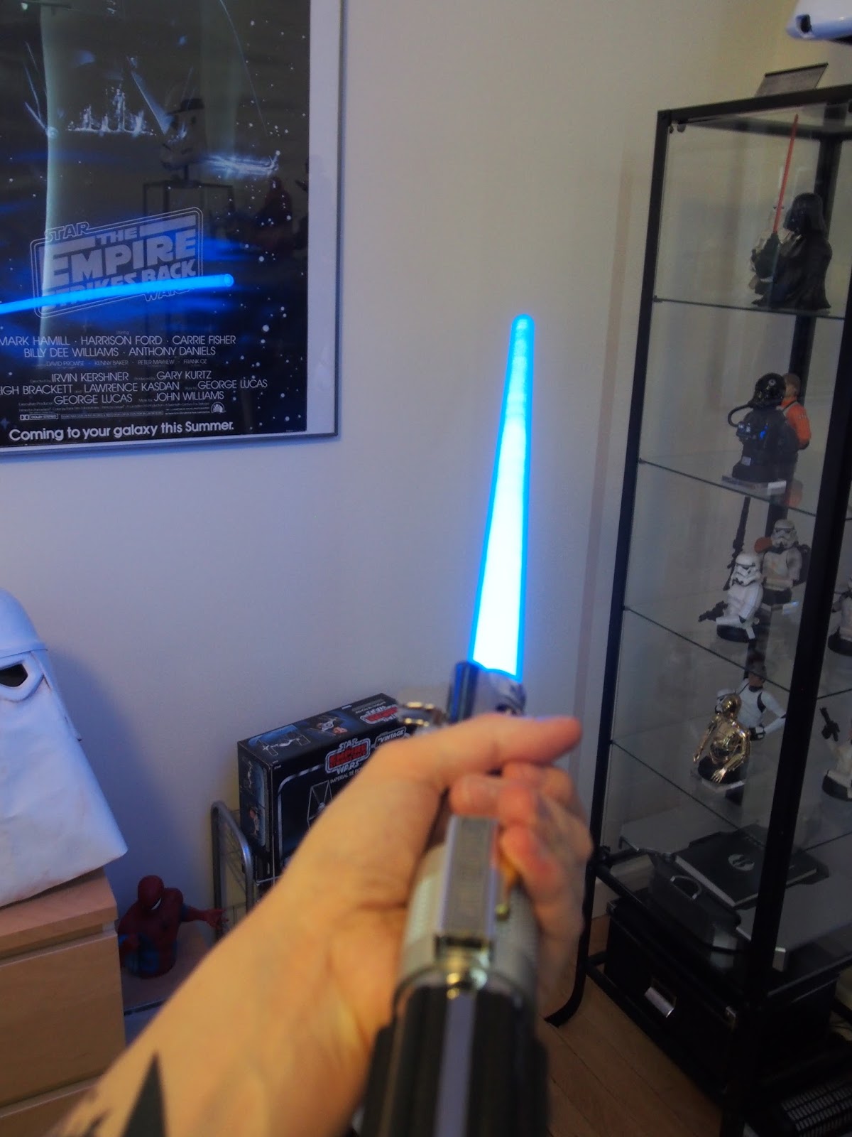 Lorsqu’on l’allume, on sait alors que malgré la trentaine passée, on va passer un sacré bout de temps à bretter dans le vide face à un Dark Vador imaginaire. La lame s’illumine du manche vers la pointe, dans un bruit remarquable de réalisme. Le gyroscope fait très bien le travail, accompagnant chaque mouvement ample d’un sifflement caractéristique. Contrairement à ce que peuvent laisser penser certaines photos plus bas, la lumière est équilibrée et constante tout au long de la lame. Le bleu est clair et assez fidèle aux films.